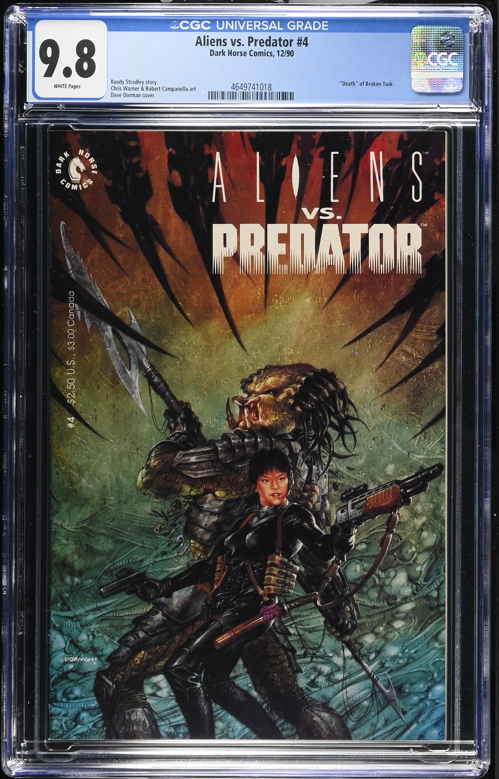 Aliens vs. Predator #4 from 12/90 offers a glimpse into the era's iconic storytelling. Featuring "death" of broken tusk., this issue is a must-have for collectors. Add this CGC 9.8 graded comic to your collection today!