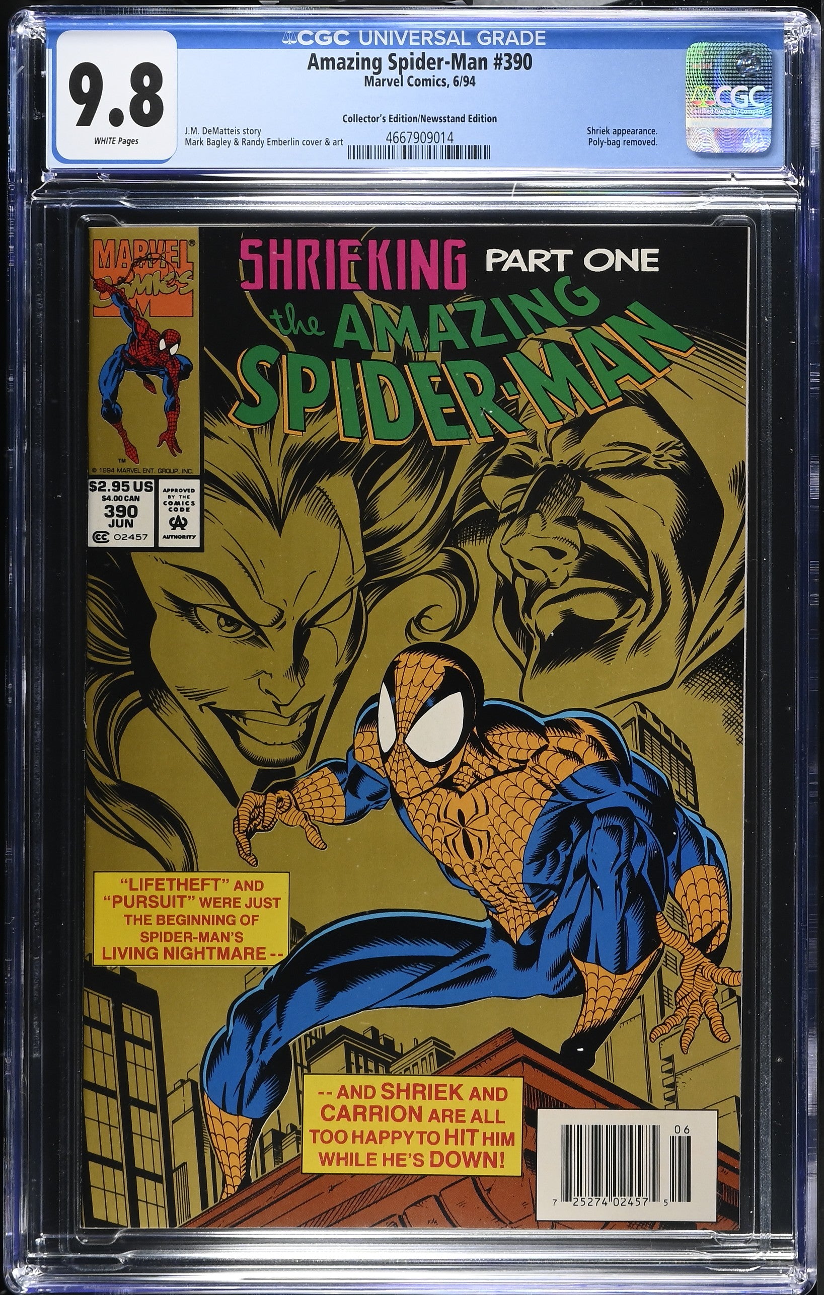 Amazing Spider-Man #390 from 6/94 offers a glimpse into the era's iconic storytelling. Featuring shriek appearance., poly-bag removed., this issue is a must-have for collectors. Add this CGC 9.8 graded comic to your collection today!