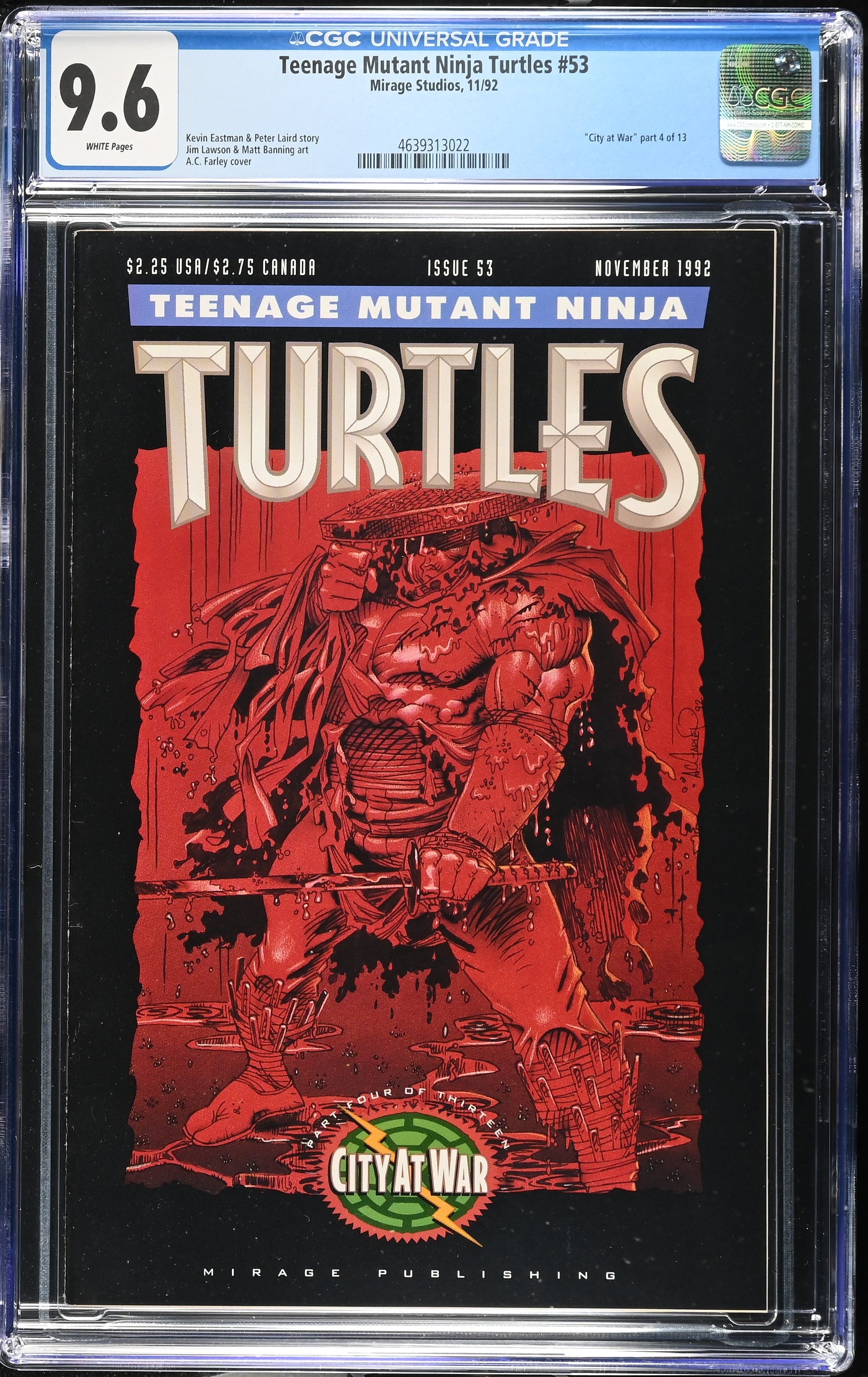 Teenage Mutant Ninja Turtles #53 from 11/92 offers a glimpse into the era's iconic storytelling. Featuring "city at war" part 4 of 13, this issue is a must-have for collectors. Add this CGC 9.6 graded comic to your collection today!