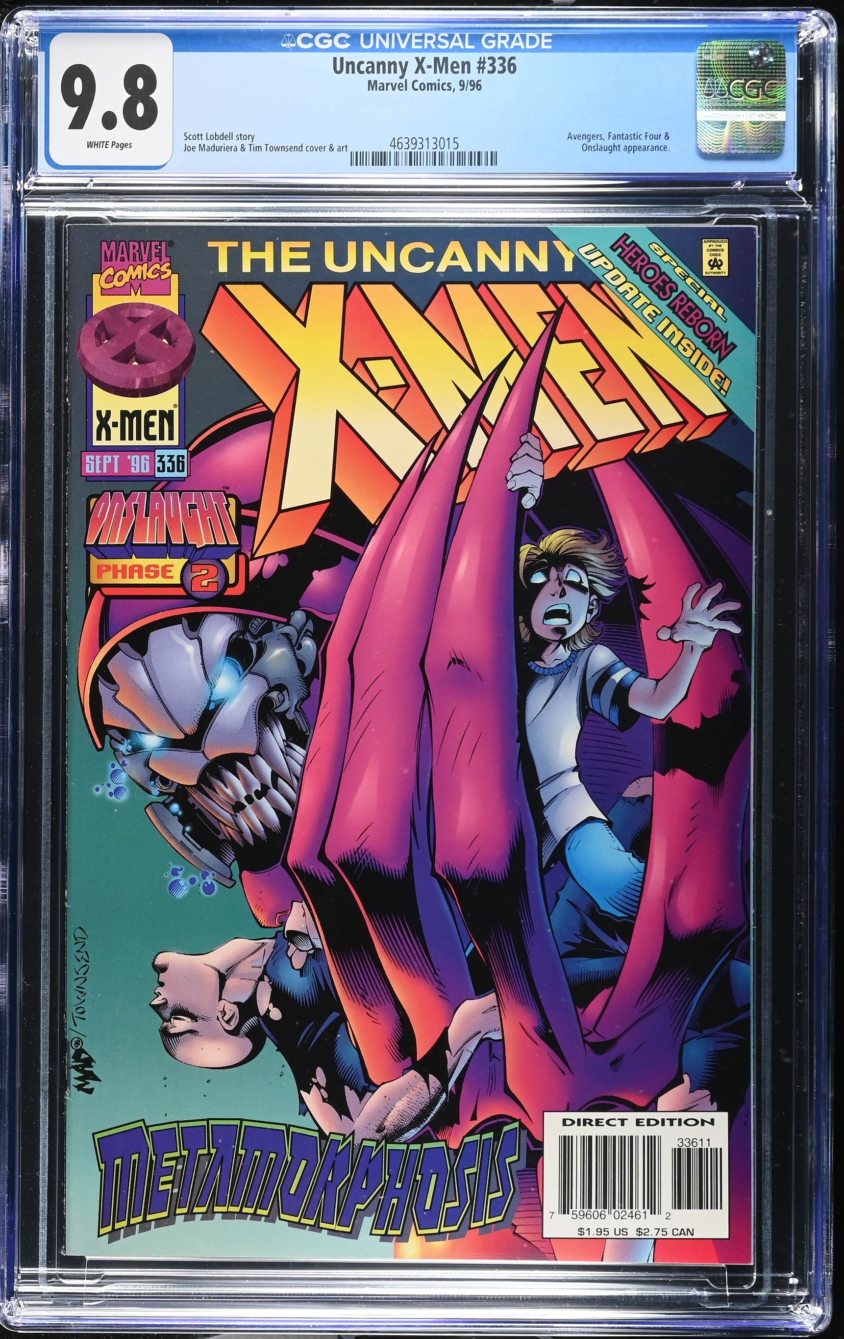 Uncanny X-Men #336 from 9/96 offers a glimpse into the era's iconic storytelling. Featuring avengers, fantastic four &, onslaught appearance., this issue is a must-have for collectors. Add this CGC 9.8 graded comic to your collection today!