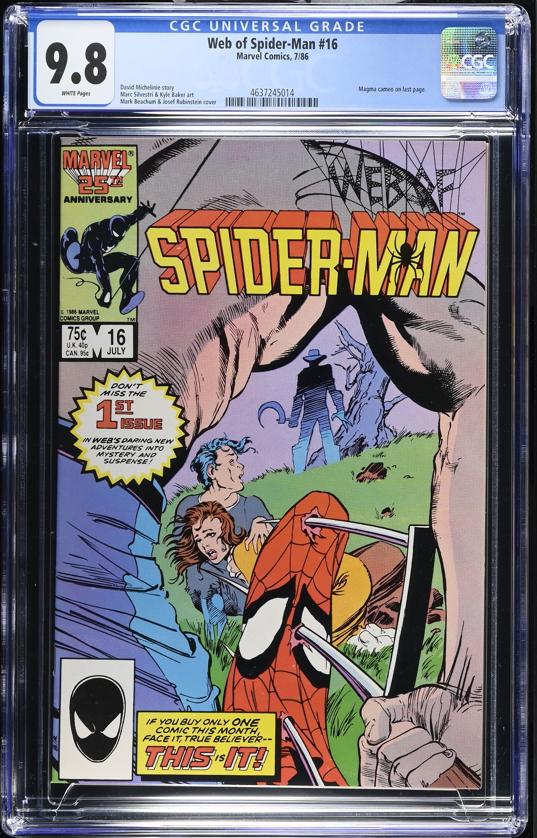 Web of Spider-Man #16 from 7/86 offers a glimpse into the era's iconic storytelling. Featuring magma cameo on last page., this issue is a must-have for collectors. Add this CGC 9.8 graded comic to your collection today!