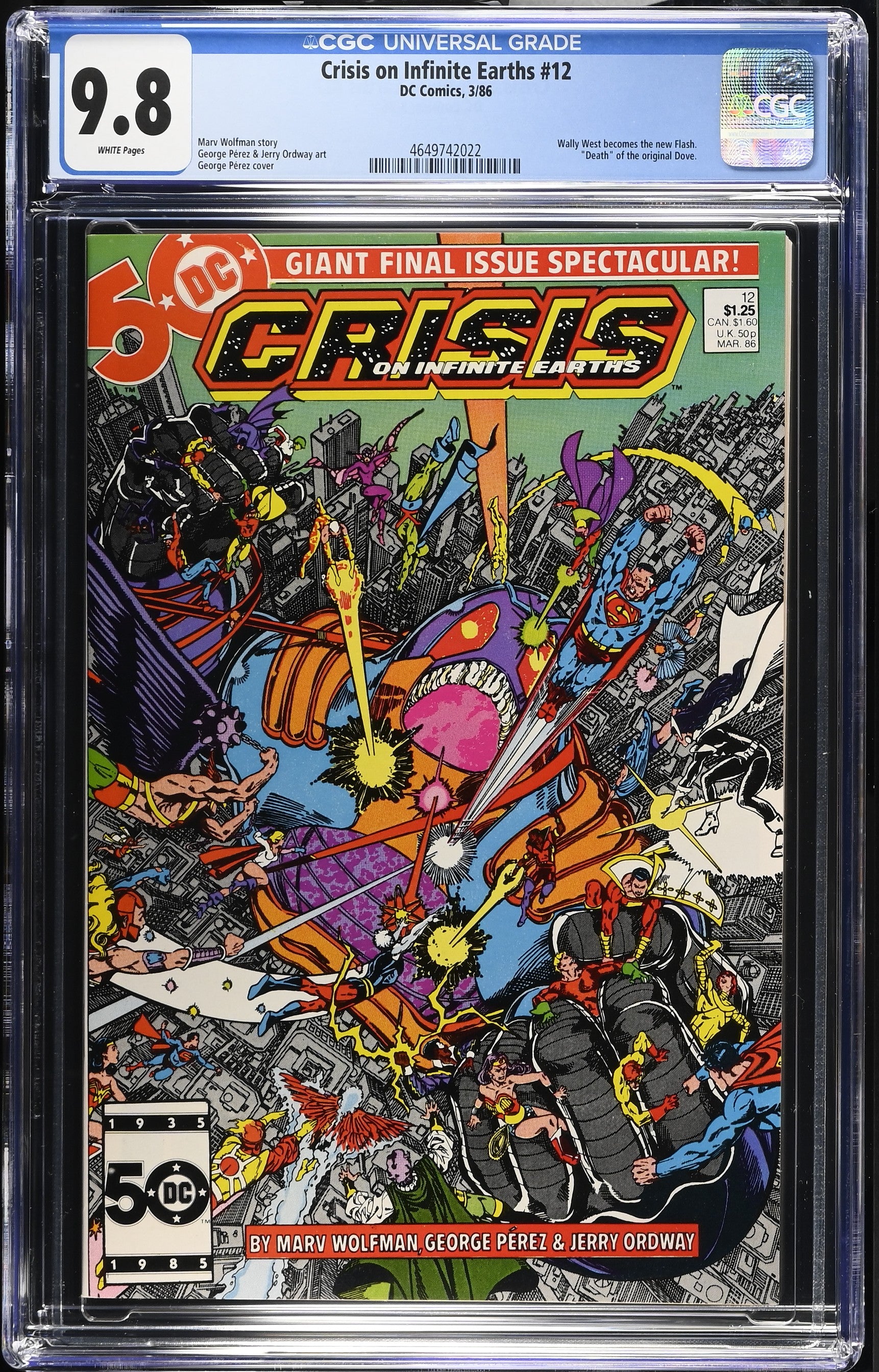 Crisis on Infinite Earths #12 from 3/86 offers a glimpse into the era's iconic storytelling. Featuring wally west becomes the new flash., "death" of the original dove., this issue is a must-have for collectors. Add this CGC 9.8 graded comic to your collection today!