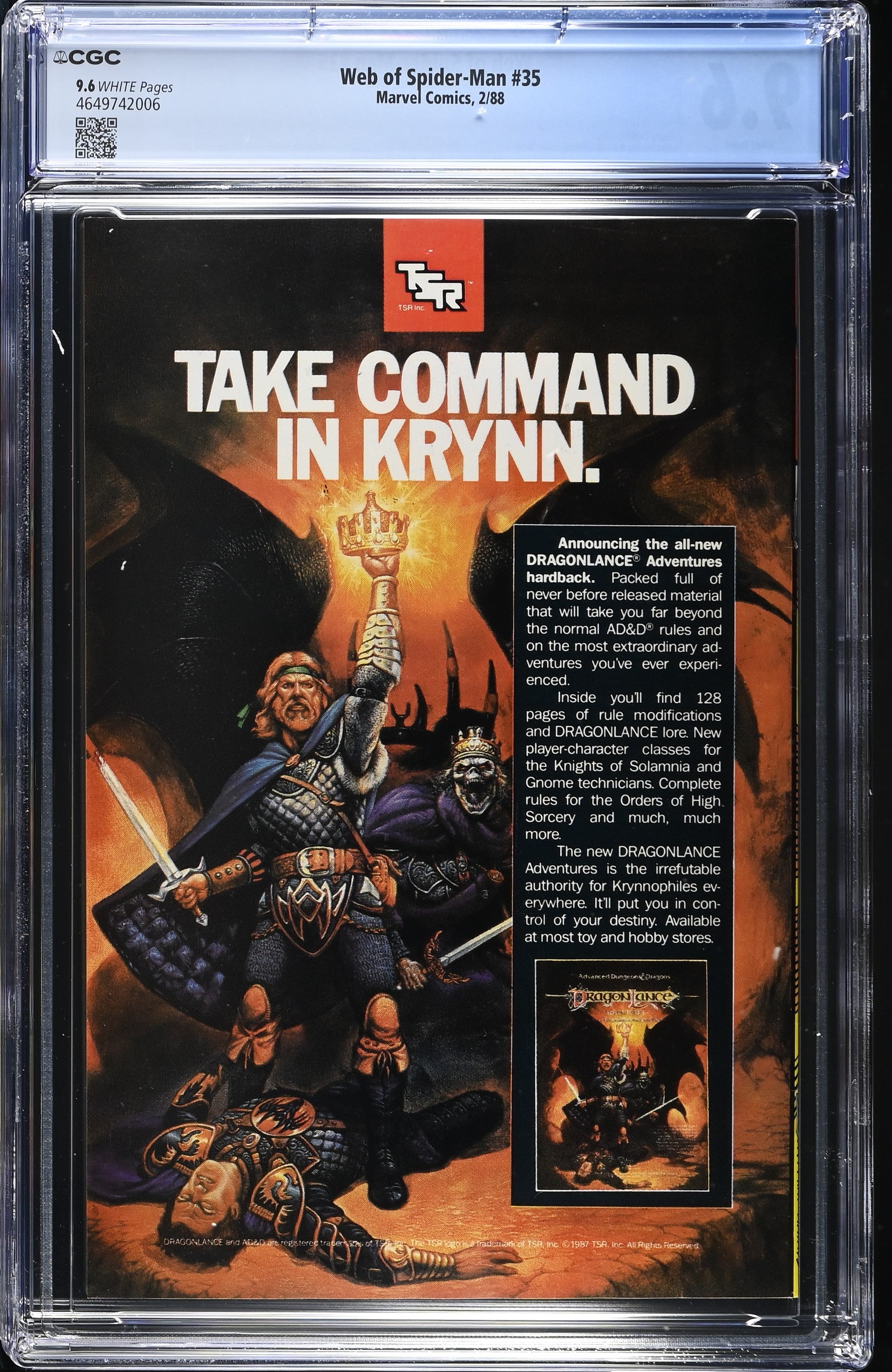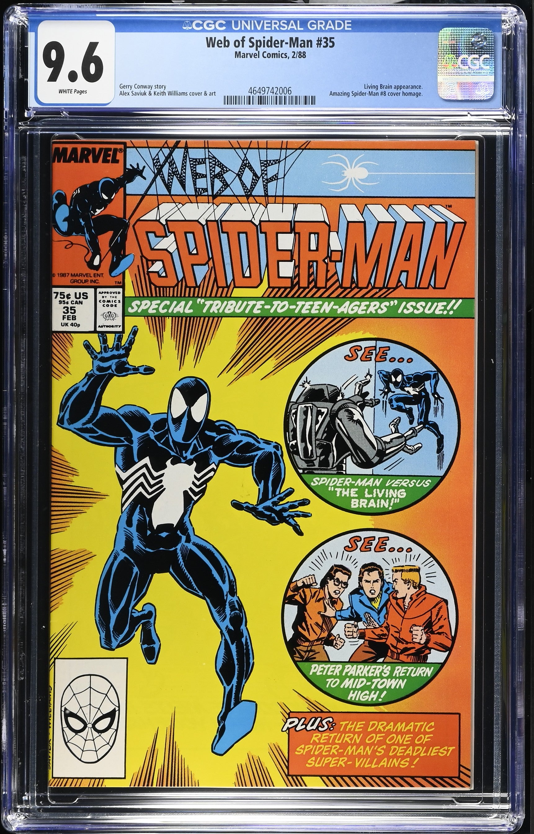 Web of Spider-Man #35 from 2/88 offers a glimpse into the era's iconic storytelling. Featuring living brain appearance., amazing spider-man #8 cover homage., this issue is a must-have for collectors. Add this CGC 9.6 graded comic to your collection today!