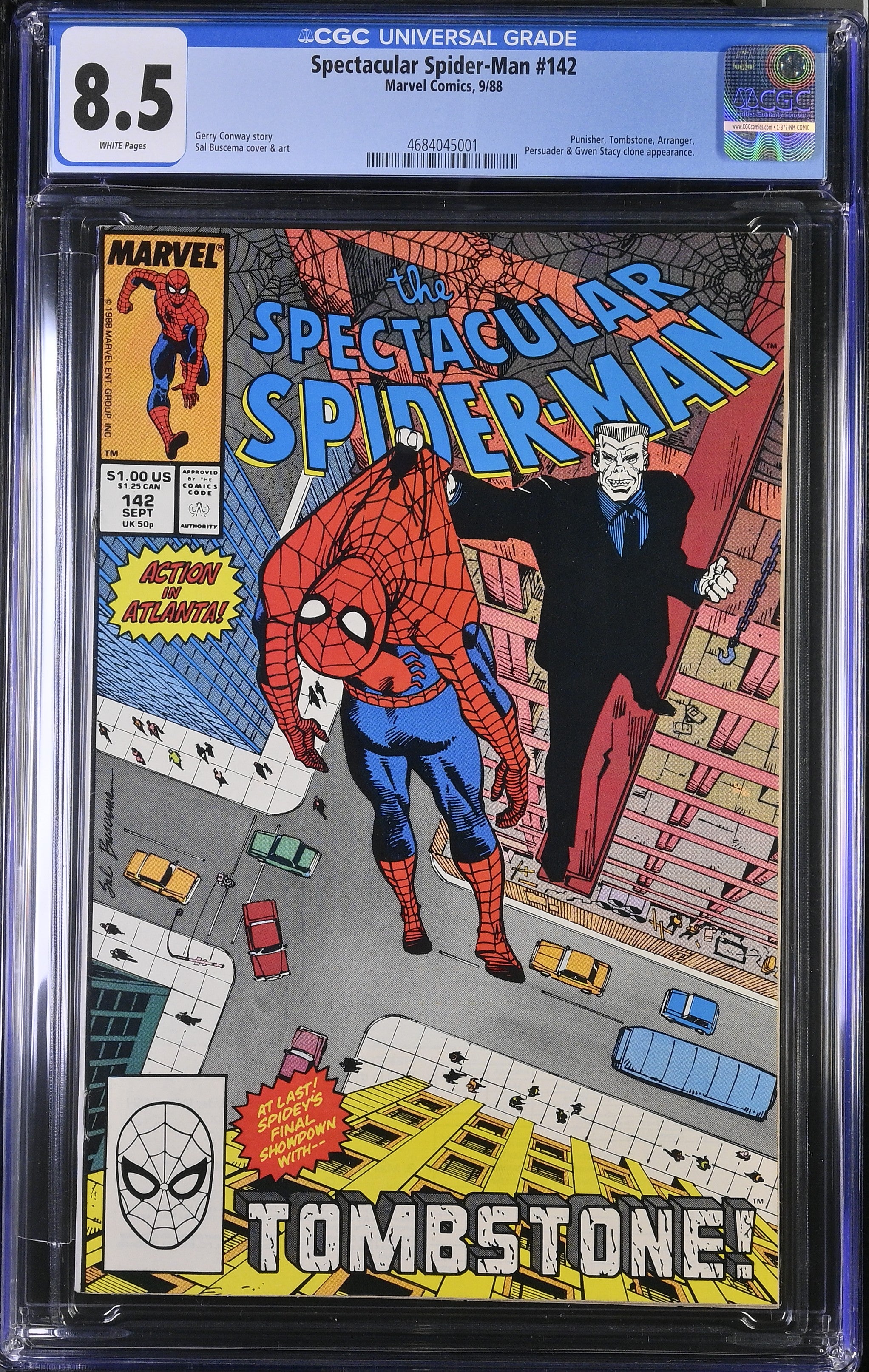Spectacular Spider-Man #142 from 9/88 offers a glimpse into the era's iconic storytelling. Featuring punisher, tombstone, arranger,, persuader & gwen stacy clone appearance., this issue is a must-have for collectors. Add this CGC 8.5 graded comic to your collection today!