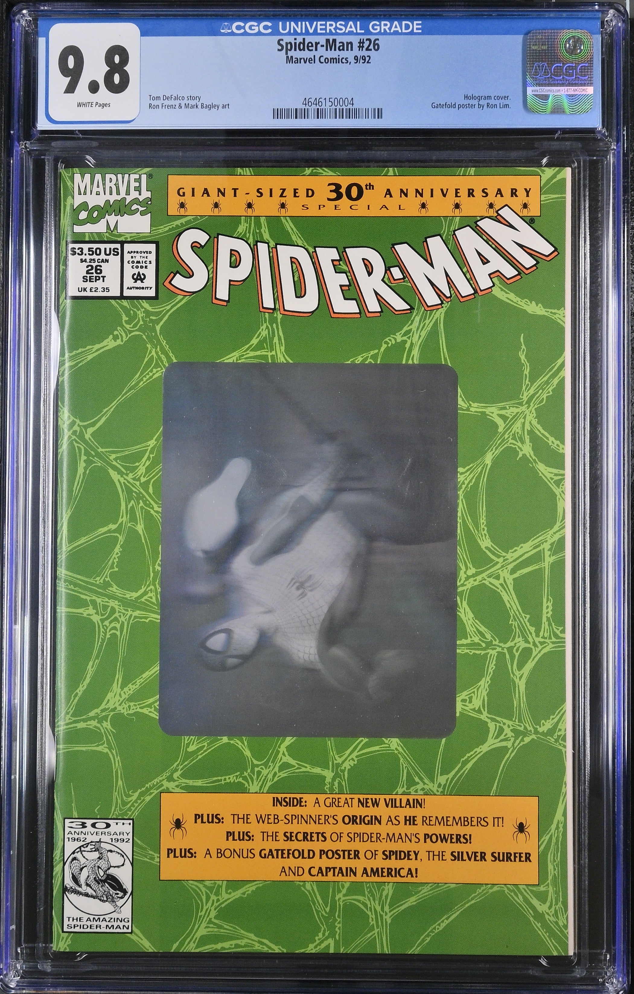 Spider-Man #26 from 9/92 offers a glimpse into the era's iconic storytelling. Featuring hologram cover., gatefold poster by ron lim., this issue is a must-have for collectors. Add this CGC 9.8 graded comic to your collection today!